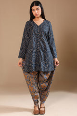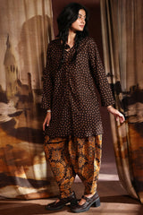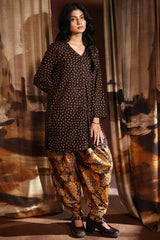 A classic-fit printed shirt with a round neckline and loop buttons along the front slit. Paired with complementary printed tulip shalwar.