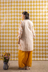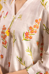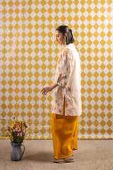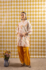 An easy-fit embroidered kurta featuring a band V-neckline embellished with delicate phool and tassel detailing. The kurta is adorned with Rang-Barang embroidered Gulbahar motifs that bring a soft, graceful vibe. Paired with a classic farshi shalwar for a timeless, elegant look.