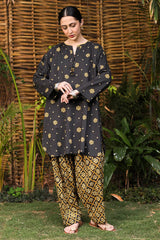 Classic-fit printed shirt with a round neckline, adorned with tassel detailing along the V-slit. Designed with drop shoulders and a rounded hemline for a relaxed silhouette. Paired with a coordinated printed classic-fit shalwar.