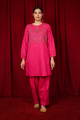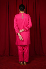 Handcrafted kurta with a round neckline, featuring intricate beadwork and stitching details on the bodice, which enhance its overall look. The cinched sleeves are adorned with matching beadwork on borders, and additional beadwork heart is placed on the back. Paired with a solid-colored shalwar, this ensemble is a perfect blend of elegance and style.