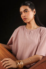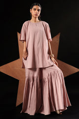 Classic-fit crinkle shirt with a keyhole neckline and soft flared sleeves. Designed with a rounded hemline for refined finish. Paired with a generously flared gharara.