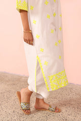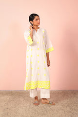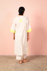 A straight-fit solid kurta featuring a round neckline with a V-slit, adorned with vibrant neon-hued ralli motifs. The design includes detailed motif lines at the front, a statement motif at the back, and bold accents along the shirt hem and sleeve borders. Designed with drop shoulders, it can be styled with any contemporary lowers for a bold, chic look.