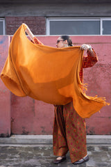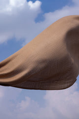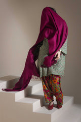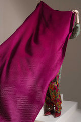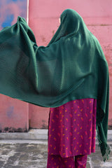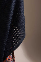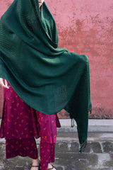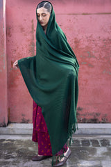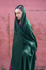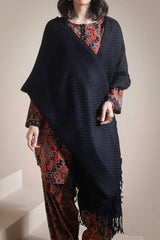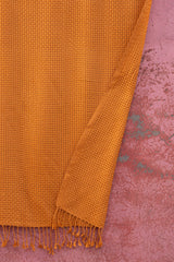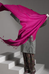 A soft woven shawl, designed for warmth and comfort, finished with loose thread edges for a subtle touch of charm.