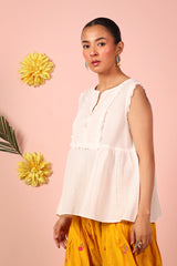 A breezy Schiffli-patterned top featuring a round neckline with a V-slit, adorned with tassel embellishments. Gathers on the front yoke and sleeve hems add style, while the empire waist flare offers a soft, flattering silhouette. Pairs with any bottoms.