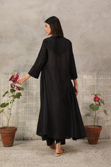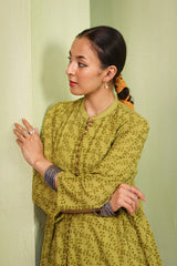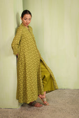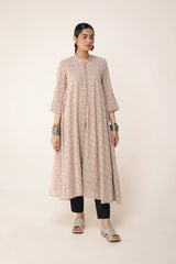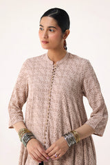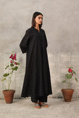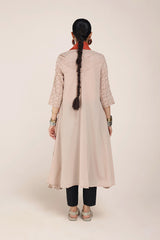 A classic flared frock-style kurta featuring a band round neckline. The exclusive Schiffli-patterned fabric adds a refined appeal, while the open front slit is adorned with delicate button details. The sleeve hems are finished with subtle lace accents. Soft, delicate pleats at the back add graceful movement to the silhouette. Can be paired with any Gen bottoms for a complete look.