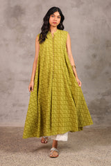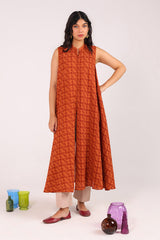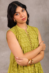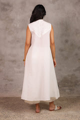 A classic-fit, long A-line schiffli dress featuring a low band neckline and loop-button detailing along the front slit. Finished with delicate lace on the sleeve hems and soft pleats at the back for a timeless look.
