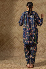Paneled printed A-line shirt with a round neckline and V-slit, finished with delicate tassel detailing. Paired with a matching printed pegged shalwar for a coordinated look.