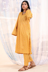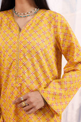 Classic-fit printed shirt with a V-neckline, exquisitely detailed with delicate gota accents along the neckline and sleeve hems. Paired with matching printed straight-fit trousers for a refined, elongated silhouette.