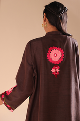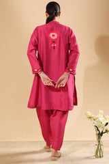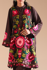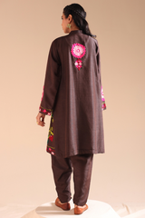 Embroidered classic-fit kurta with a low band neckline with a buttoned front placket. Thoughtfully detailed embroidery enhances the design. Paired with a pegged shalwar for a refined, contemporary silhouette.