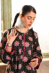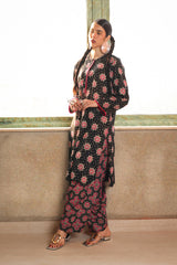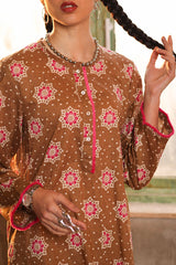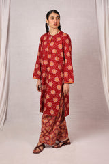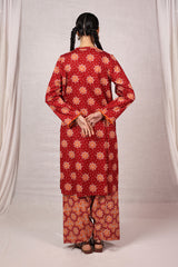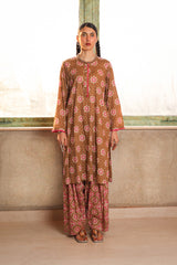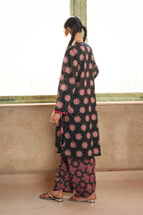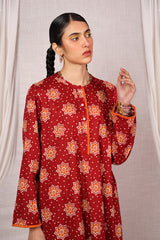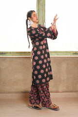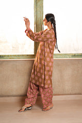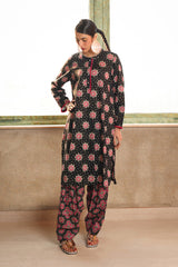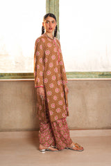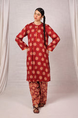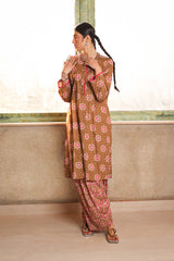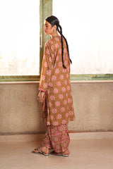 An ethnically crafted Dabu print kurta featuring a round neckline. The front placket and sleeve hems are enhanced with vibrant-colored frills. The ensemble is paired with a coordinated, printed loose-fit shalwar, ensuring both comfort and style.