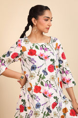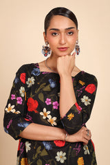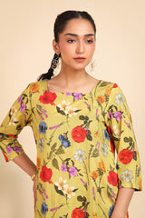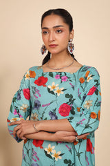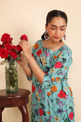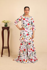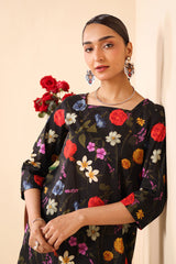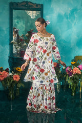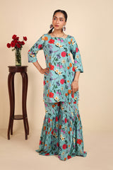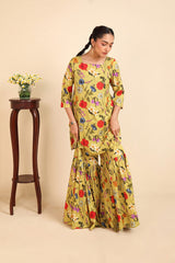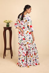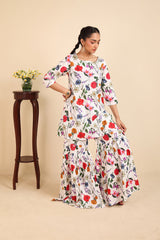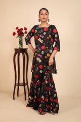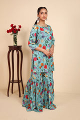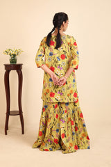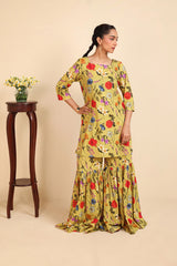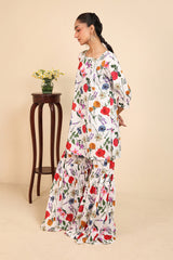 A floral-printed shirt with a square neckline, designed to create a harmonious flow of patterns. Paired with matching printed gharara, it adds the perfect finishing touch to the outfit, enhancing its overall charm.