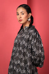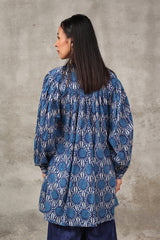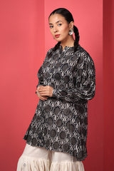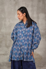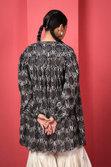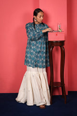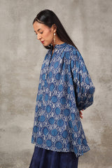A Nandana-printed, loose-fit A-line kurti features a round band neckline with buttons on the front placket and an open slit. The gathers at the back add a flattering flare, while the cinched sleeves complete the look. It can be paired with any generation bottom for a versatile style.