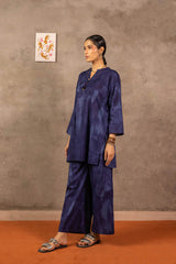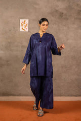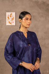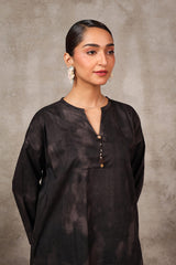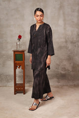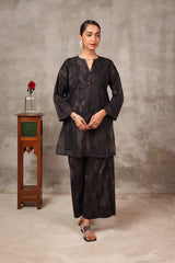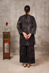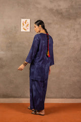 Moon shadow printed kurta featuring a band round neckline with a V-slit, enhanced with intricately crafted tassel embellishments. Paired with matching printed wide-leg trousers, this ensemble offers exquisite look.