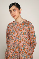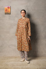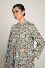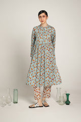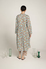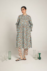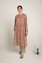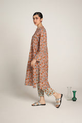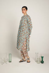 A loose fit printed panelled shirt with mandarin neckline, featuring buttons on the placket and gathers at the waist. Paired with a contrast printed straight fit trouser.