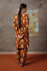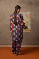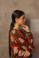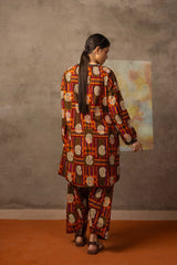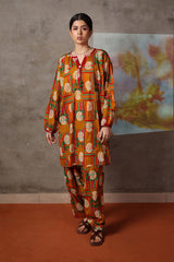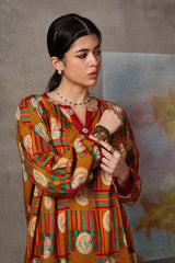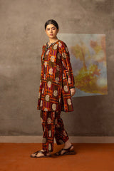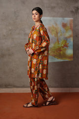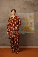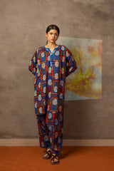 A loose-fit classic printed kurta featuring a round neckline with a V-slit, adorned with button and tassel details. The neckline and placket are framed with a solid trim for a defined finish. Cinched sleeves add structure, Paired with matching printed classic-fit shalwar is adored with running stitch details along the ankle hemline, completing the look with subtle refinement.