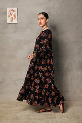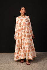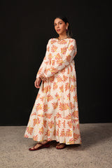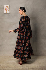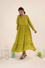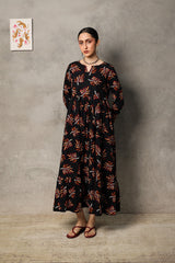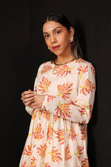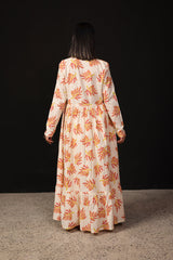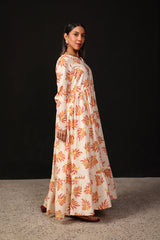 A long, flared, relaxed-fit printed long frock offers effortless featuring round neckline and V-slit. The gathers around the empire waist naturally enhance the silhouette, creating a graceful and flattering flare. Perfectly designed for a comfortable yet stylish look.