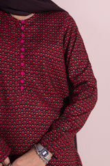 A classic-fit gold-printed shirt featuring a round neckline and loop buttons along the front slit and sleeve slits. Paired with gold-paisley printed culottes.