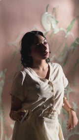 An embroidered short top with a V-neckline and button-down placket, accented with a handcrafted heart hanging that adds a touch of charm to its textured finish.