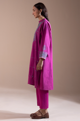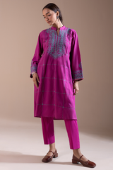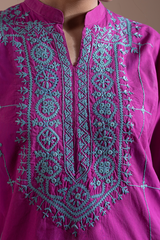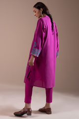 Hand-embroidered classic kurta with a low band neckline and V-slit. The delicate embroidery is enhanced with aina work, paired with straight-fit trousers for a refined finish.