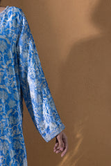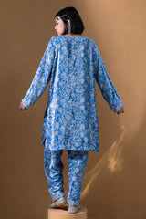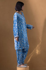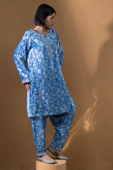 Printed velvet shirt with a round neckline and V-slit, adorned with delicate embroidered detailing along the neckline and sleeve hems. Paired with a matching printed velvet pegged shalwar, finished with embroidered borders and subtle button accents at the ankle slits.