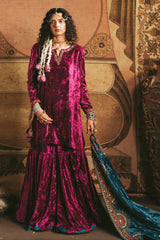 Richly crafted luxurious velvet shirt adorned with delicate  embroidery, enhanced with gota and sequin detailing along the neckline and sleeve hems. Paired with a generously flared gharara, finished with dual-tone velvet hem detailing for a truly statement, festive-ready look.
