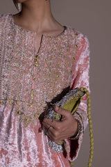 Luxurious velvet shirt adorned with delicate embroidery, enhanced with gota detailing on the bodice and sleeve hems. Paired with a velvet pegged shalwar and styled with an organza dupatta finished with gota lace and tassel detailing for a festive statement look.