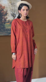 Printed in deep tones, this classic-fit shirt features a round neckline with buttons along the front placket. Designed with cuffed sleeves and side pockets for ease. Paired with a matching printed classic-fit shalwar.