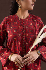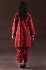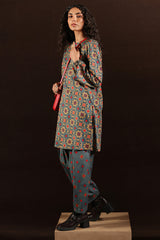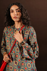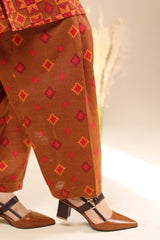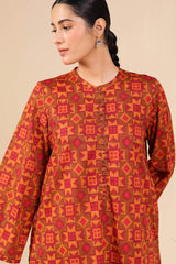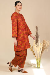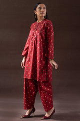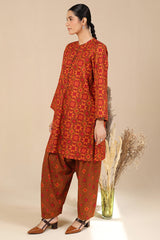 A classic-fit printed shirt with a low band neckline and loop-button detailing along the front slit. Paired with a printed classic-fit shalwar, finished with stitched detailing at the ankle hemline.