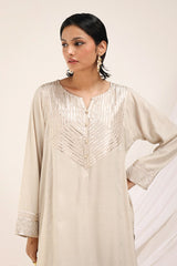 A classic fit kurta featuring a round neckline with a V-slit, enriched with intricate gota embellishments. The bodice showcases a refined gota pattern, while the sleeve hems shimmer with a luminous gota glow design. Soft pleats on the shoulders add structure. The side slits and shirt hem are adorned with delicate gota detailing. Paired with a classic shalwar featuring gota lace on the ankle hem.