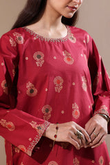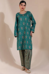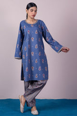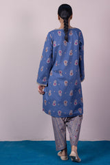 Gold-printed classic-fit shirt adorned with delicate embroidered detailing along the neckline and sleeve hems. Paired with a coordinated printed khula-poncha shalwar.