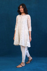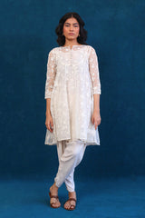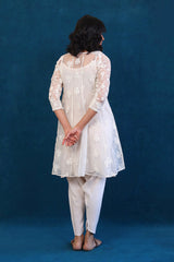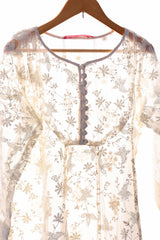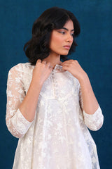 Organza,panelled flared shirt with embroidery details all over and button details on neckline, paired with pegged shalwar and a cotton silk undershirt.