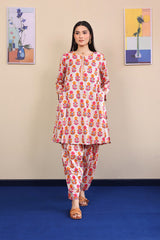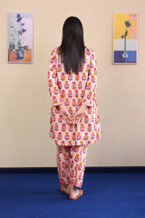 Short printed loose-fit shirt with side pockets with fabric detailing on sleeves and neckline. Full length sleeves and round neckline with buttoned placket. Paired with matching printed shalwar.
