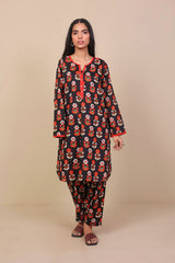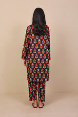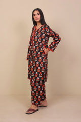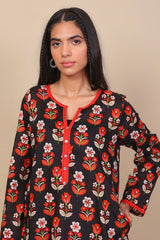 Long printed tunic with side pockets with fabric and stitch details on pocket, sleeves and neckline. Full length sleeves and round neckline with round neckline with V dip and buttons on placket. Paired with matching shalwar.