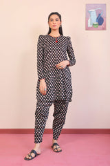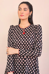 A floral printed tunic with round neck and button detail, puffed, full length sleeves, Paired with a matching printed pegged shalwar.
