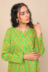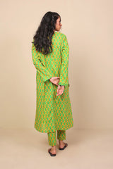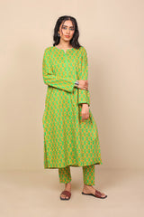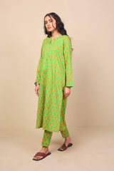 Long printed shirt with fabric strip on sleeves, neckline and front and back center. Full length sleeves and round neckline with V-dip. Paired with matching printed trousers.