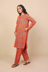 Printed straight tunic with pockets on side, fabric and stitching detailing on sleeves and neckline. Full length sleeves and round neckline with slit. Paired with matching printed shalwar.