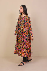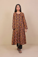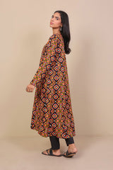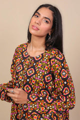 A-line front slit long shirt with full length sleeves and placketed round neckline.