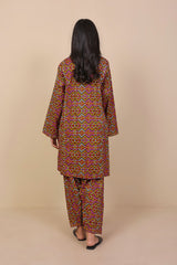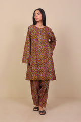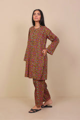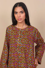 Printed short panelled shirt with side pockets and stitching details all over. Loose-fit sleeves and round neckline with buttoned placket. Paired with matching printed shalwar.