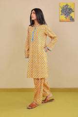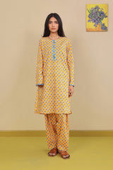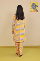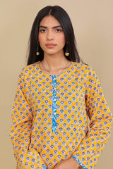 Straight printed shirt with side pockets, fabric detailing on straight sleeves and round necked placket. Paired with printed shawlar.