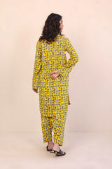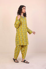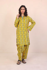 Printed kameez with buttons, shells and tassel details on neckline. Paired with classic fit printed shalwar.