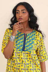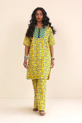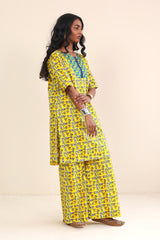 A block print shirt with half sleeves, round neck with dip, paired with flary bell bottom culottes.
