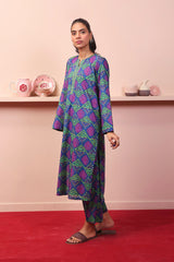 A long loose shirt with round neck with dip, full sleeves and paired with matching printed straight pants.