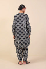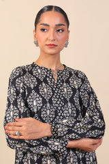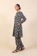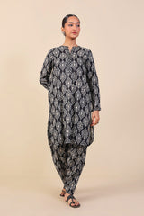 Printed round hem shirt with contrasting print fabric detailing on straight sleeves, round neckline and paired with matching shalwar.