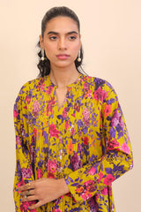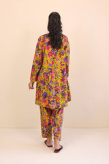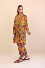 Flared printed shirt with stitched pleat details, paired with straight fit pants.