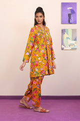 Flared printed shirt with stitched pleat details, paired with straight fit pants.