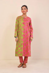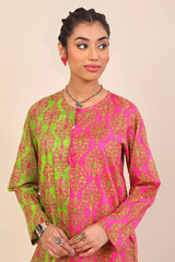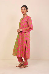 A multi block inverse printed kurta with round neck, tassels and slit, full sleeves, Paired with straight pants.