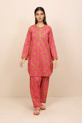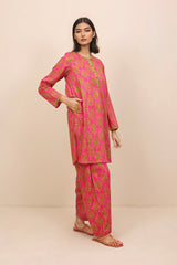 Printed co-ord set with round hem shirt, pockets on side, straight sleeves and round neckline with buttoned placket and a matching shalwar.