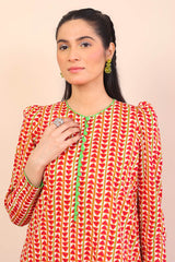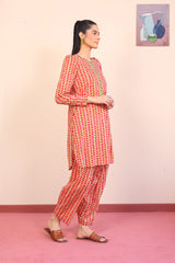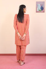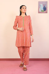 A printed short shirt with fabric button loops on placket with fitted full sleeves. Paired with a matching printed shalwar.