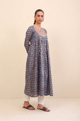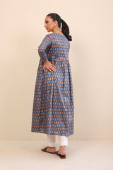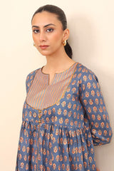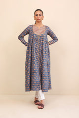 Bib neckline, printed flared dress with gather details on waist and adorned with golden button details.
