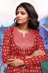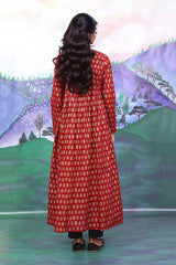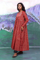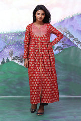 Bib neckline, printed flared dress with gather details on waist and adorned with golden button details.